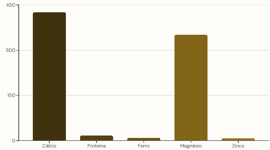 O tahine é uma fonte excepcional de minerais essenciais, destacando-se especialmente pelo alto teor de cálcio, magnésio e ferro, fundamentais para a saúde óssea, muscular e sanguínea.